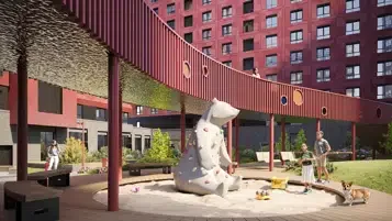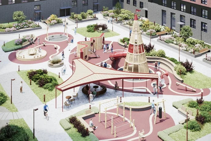 Проект благоустройства делит территорию на три отдельных двора. Каждый — со своим характером. Дворы связаны визуально и с помощью пешеходных дорожек, вписанных в рельеф. Деревья, кустарники, высокие газоны, рельеф со злаковыми растениями и другими травами дарят чувство близости к природе.