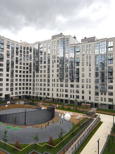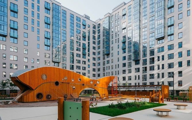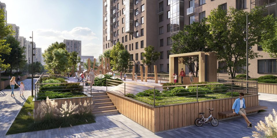 Во дворах жилого комплекса реализовано единое благоустройство — проект «Фантастический лес» с 8 игровыми зонами и спортивной площадкой. Во дворе первого корпуса расположена большая детская площадка «Крупная рыба».