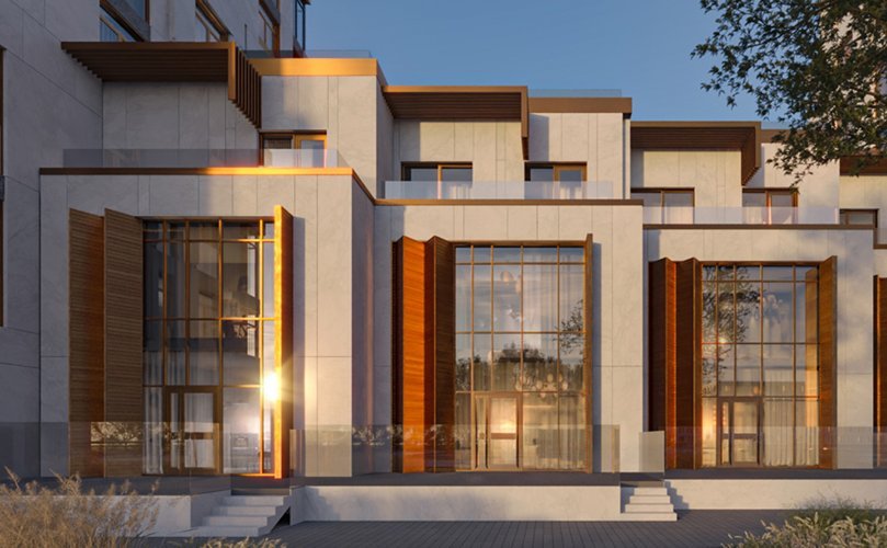 Фасады проекта выполнены из панелей с имитацией листов латуни и крупноформатных плит, имитирующих светлый природный камень. В местах общего пользования выполнена дизайнерская отделка с использованием премиальных материалов.