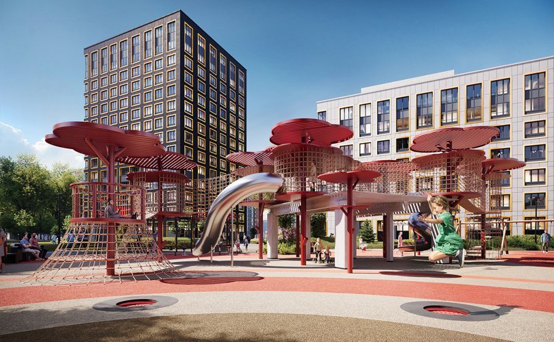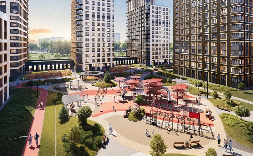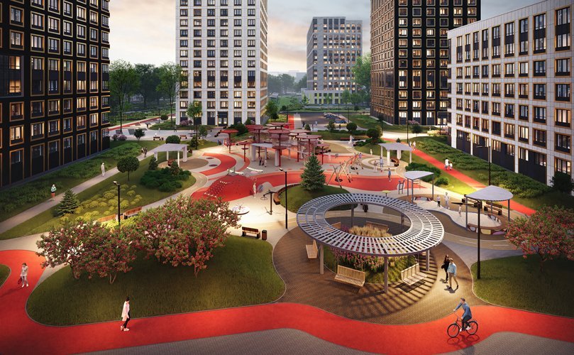 Для жителей предусмотрены просторный центральный двор-плейхаб с разными форматами активностей, беговая дорожка, сад непрерывного цветения, настольный теннис, детская площадка и зона для стритбола.