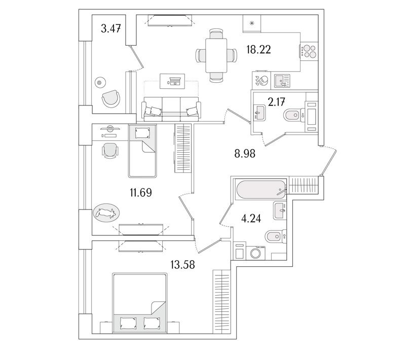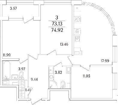 В проекте представлен широкий выбор планировок: студии и квартиры с 1–3 спальнями, в том числе европланировки. Доступны квартиры с кухнями-гостиными, мастер-спальнями, гардеробными и просторными лоджиями. Высота потолков варьируется от 2,74 до 3,04 м. Помещения идут без отделки, в подчистовом или чистовом исполнении — в зависимости от корпуса.