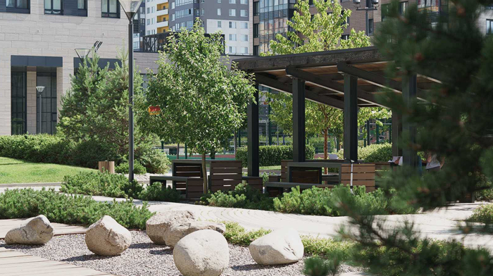 В основе проектирования двора — авторская модель внутренней среды на базе компонентов, объединенных в 4 группы: мультисценарность, геймификацию, органомику и безопасность. Благодаря такой модели удается обеспечить многообразие решений и вариативность сценариев пользования.