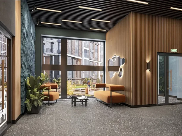 Общественные пространства сочетают в себе два основных принципа — функциональность и домашний уют. Такой стиль созвучен активным и свободолюбивым людям. В дизайне входных групп и парадных использованы декоративные элементы с текстурами дерева и натурального камня с приглушенной подсветкой теплым светом. Во входных группах обустроены гостевые зоны с мягкой мебелью.