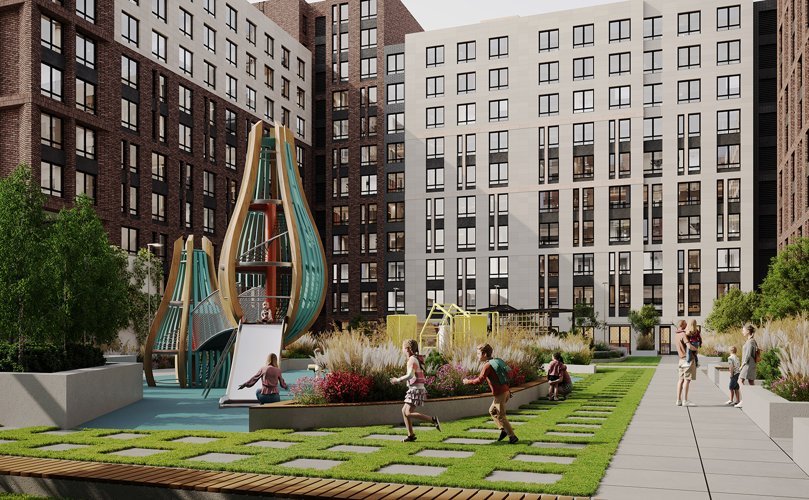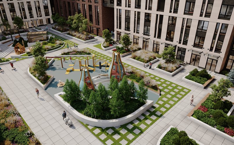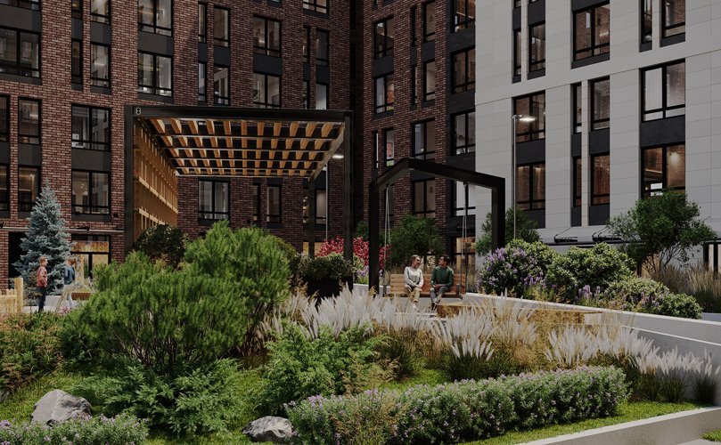 В комплексе предусмотрен добрососедский центр, включающий в себя детскую игровую зону с зонами активности, отдыха и творчества, коворкинг, переговорную комнату, библиотеку, кофе-пойнт и мини-маркет. На территории высажены деревья и кустарники, обустроена детская площадка. В проекте предусмотрен собственный детский сад, расчитанный на 80 мест. Для хранения транспорта есть подземный паркинг и велопарковка.