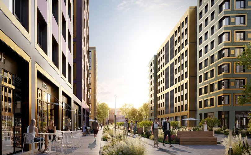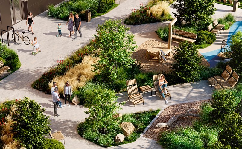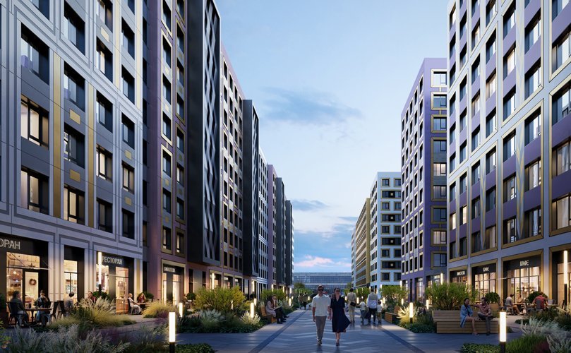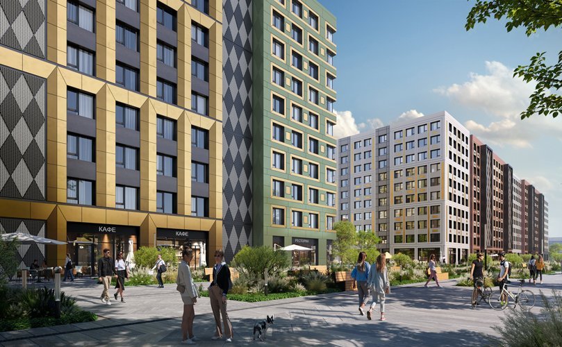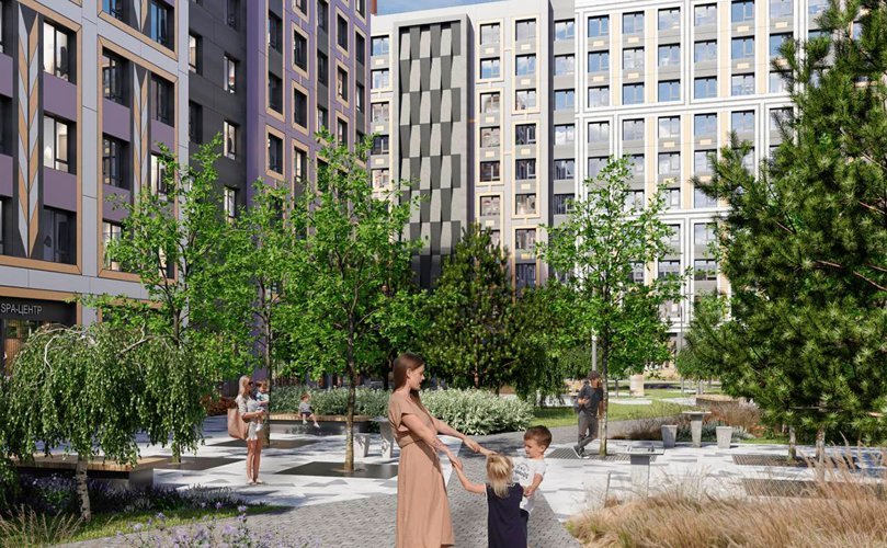 Территория комплекса благоустроена: выполнено фактурное озеленение, спроектированы места отдыха взрослых и детей, имеется протяженная прогулочная зона с разнообразным инфраструктурным наполнением.