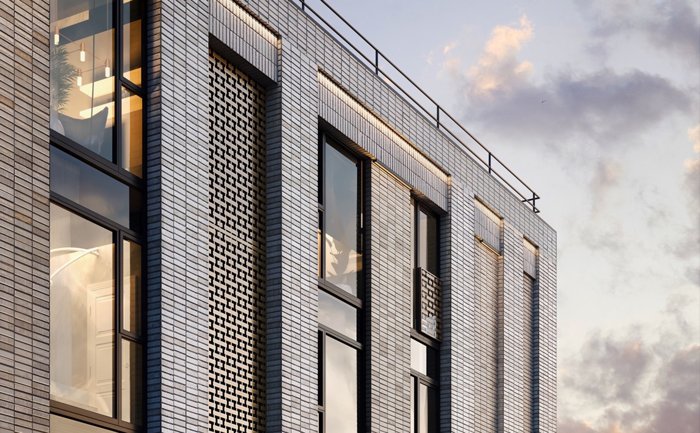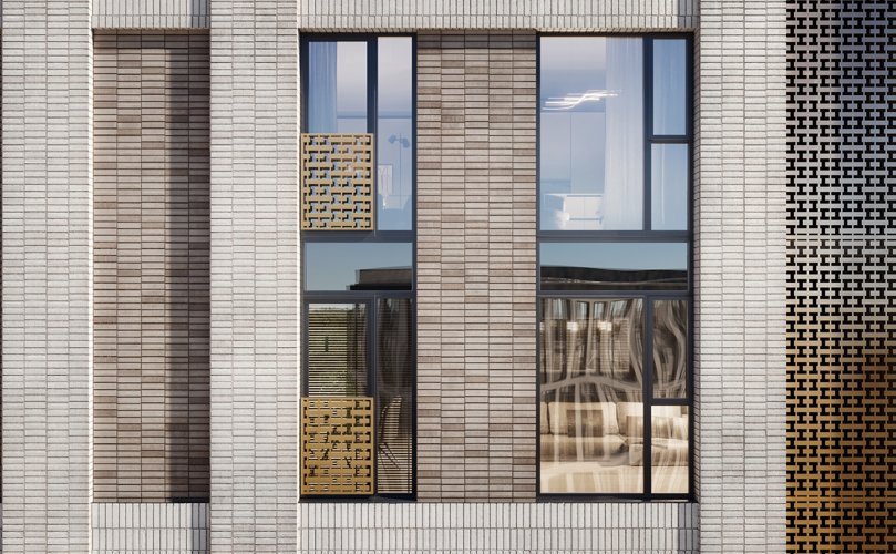 Подсветка фасадов и элементов внутреннего двора, 3D кирпич на первых этажах, фасад из кирпичных панелей разного оттенка и фактуры